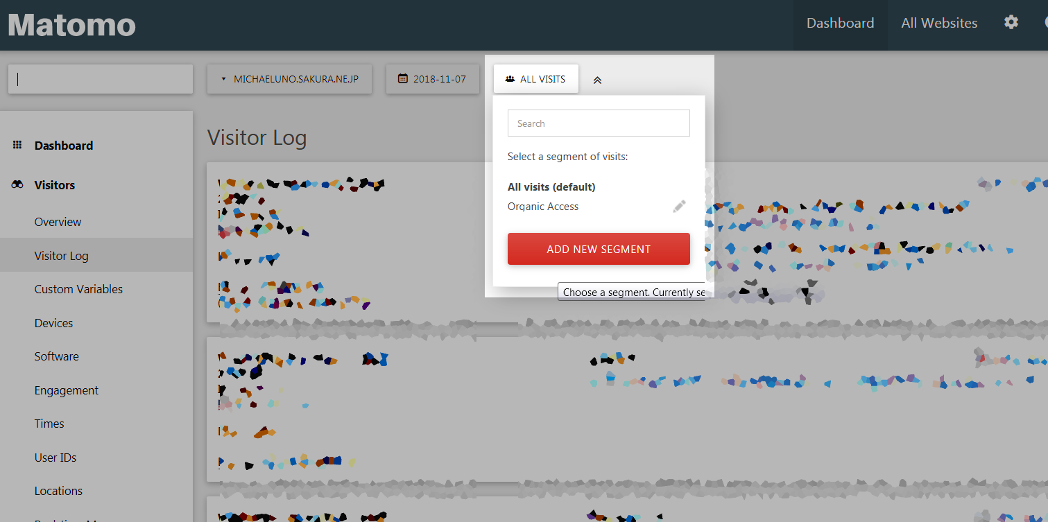 で、All Visits のところを Organic (追加したセグメント名) にすると、Bot とマークされているエントリーは消える。ただ、Non-bot でも、Jetpack のモニタリングや WordPress のピングバックのアクセスが入ってるので、Matomo 側で認知できていないものなどは完全に除外できてはいない。