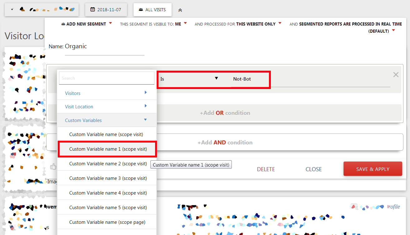 ここから Add New Segment をクリック。ポップアップのフォームで Name は Organic など適当に入れ、Action in Visit をCustom Variable name 1 (scope visit) を選択。次にすぐ右隣のプルダウンは is を選び、次のインプットフィールドに Not-bot を入力し、Save & Apply を押す。